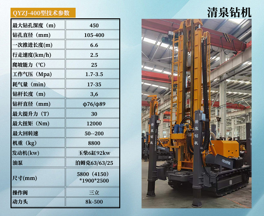 清泉400型潛孔水井鉆機 發(fā)動機功率:玉柴股份六缸92千瓦。 油泵:美國泊姆克。 動力頭馬達: BM6-390。 最大扭矩: 12000 扭米+ 最大提升力: 30噸。 操作閥:三立。 整機機重: 8.8噸。 尺寸:長5.8米(底長4.15米),寬1.9米,高2.5米。 鉆孔直徑: 105-400 毫米。 鉆桿直徑:中76/φ89(3米)。 一次性推進長度: 6600 毫米。